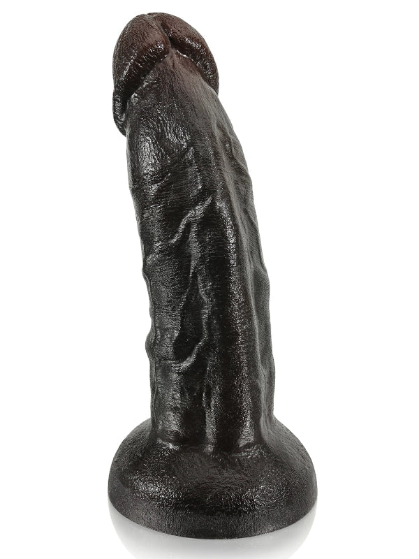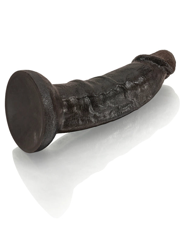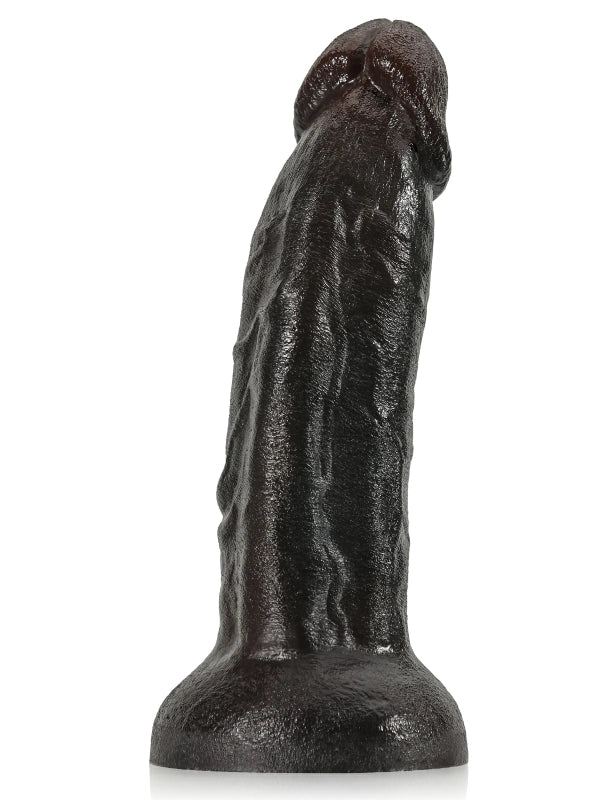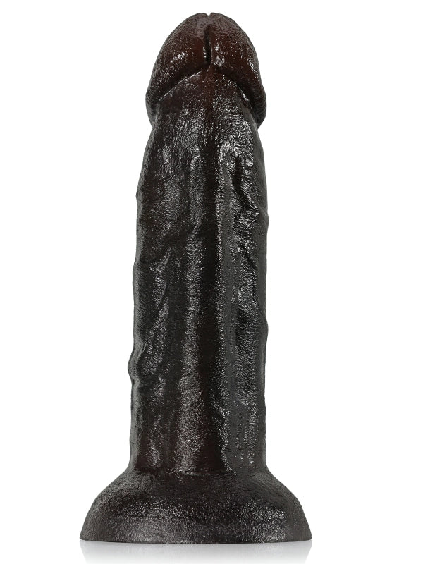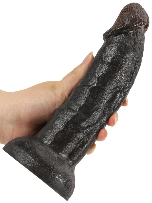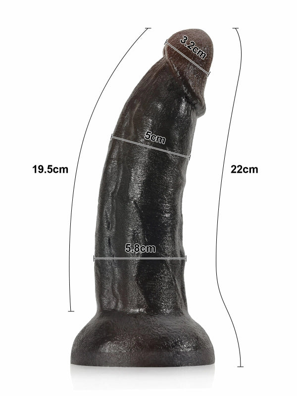 Denna dildo imponerar med en total längd på 22 cm och en kraftig diameter på 5,8 cm som skapar en stark visuell effekt. Den mörka glansen och de markerade ådrorna gör det svårt att slita blicken. Det mjuka och elastiska materialet böjs lätt i handen och känns både fylligt och flexibelt. Den stabila basen fäster säkert på släta ytor, frigör händerna och låter dig ge dig hän i en intensiv och lustfylld upplevelse.